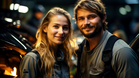Team of mechanics smiling at camera at the repair garage. AI generated