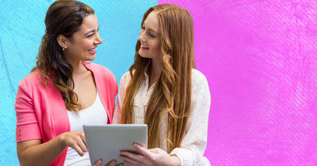 Two caucasian women using digital tablet together against blue and purple background with copy space. technology concept