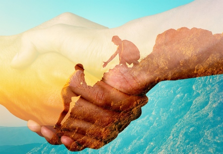 Silhouette of reaching, giving a helping hand, hope and support each other, hand help.