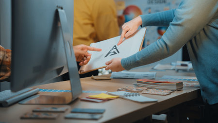 Dedicated professionals engage in lively collaboration within a modern office environment, exchanging ideas and presentation materials, promoting creativity and innovation. SACTR