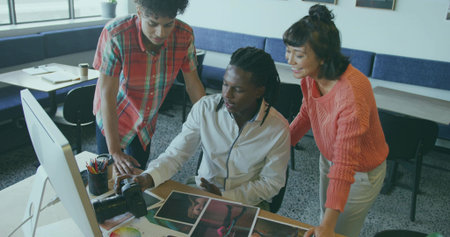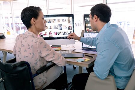 Rear view of diverse graphic designers discussing over computer at desk in a modern office. Disabled mixed-race female designer is sitting in wheelchair.