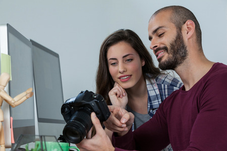 Professional photographers discussing pictures in modern studio