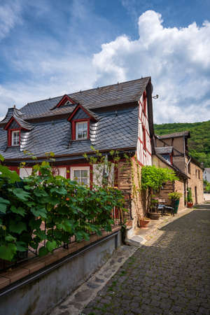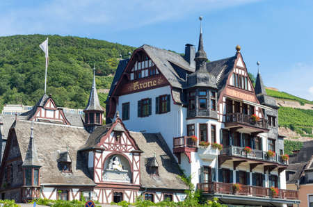 View on historical German frame house with hill and vineyards in the background on summer sunny day. Assmannshausen, Germany - August 1 2015