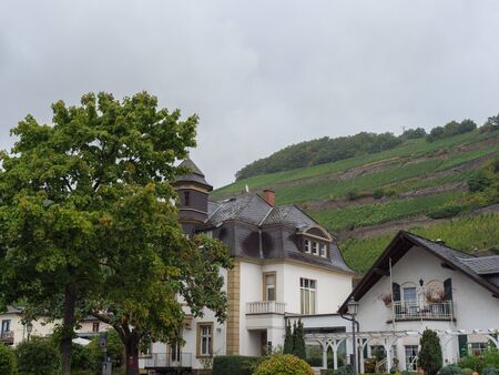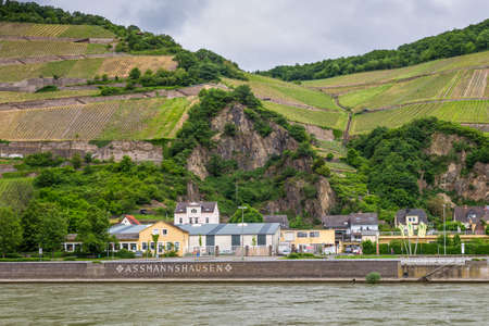 Assmannshausen, Germany - May 23, 2016: Vineyards in the Assmannshausen village on the Rhine river in cloudy weather, Hesse, Germany.