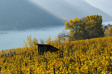 Vineyards near Weissenkirchen Wachau Austria in autumn colored leaves on a sunny day