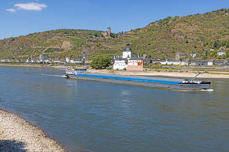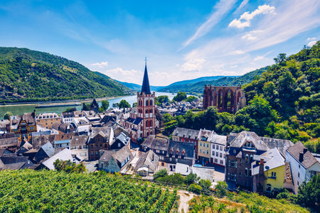 Sankt Goarshausen, Germany - August 11, 2018: Sankt Goarshausen Town on Rhine River, romantic Rhine valley landscape at beautiful summer day in Germany.