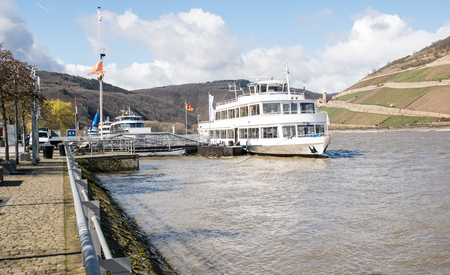 Ferry pier. Smooth flow of the great river Rhine. Journey into the German Middle Ages. Romantic castles on the banks of the Rhine.