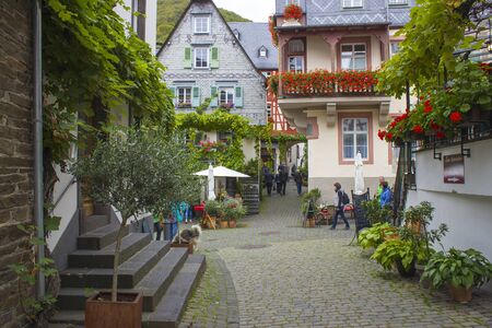 Street in old German town with traditional medieval timber framing houses, Mosel river valley, Germany