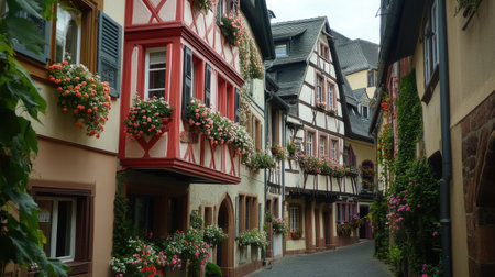 A charming corner of the old city of Mainz, with its traditional German architecture, flower-adorned balconies, and lively street scenes.