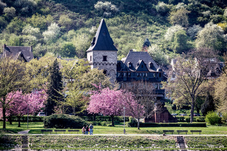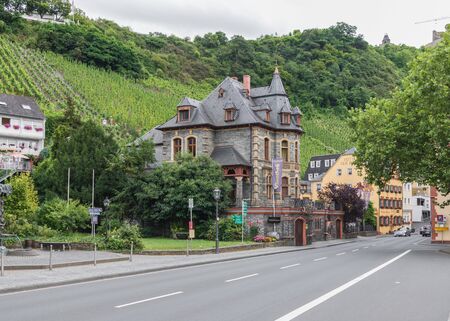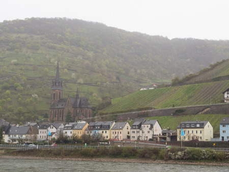 Trechtingshausen, Germany - May 23, 2016: Trechtingshausen village in the Unesco World Heritage area of the Rhine Valley in cloudy weather at the Mainz-Bingen district in Rhineland-Palatinate, Germany.