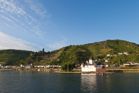 KAUB, GERMANY - SEPTEMBER 2: Pfalzgrafenstein Castle on an isle in the river Rhine at Kaub, Germany on September 2, 2013. Built 1326 to 1327 by King Ludwig the Bavarian it hosts now a museum. Foto taken from a passenger ship on the Rhine.