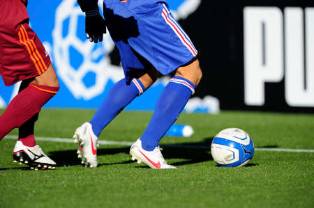 This image presents a close-up of soccer players' feet and a ball on green grass. The composition emphasizes action, with players seemingly engaged in a match. Visuals showcase muted colors, hinting at a cool tone. This image may be suitable for commercial uses in sports, fitness, or activity-related projects.