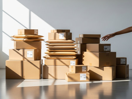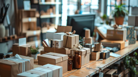 Flat lay of e-commerce packaging like cardboard boxes with white copy space beside it for online retail product listings