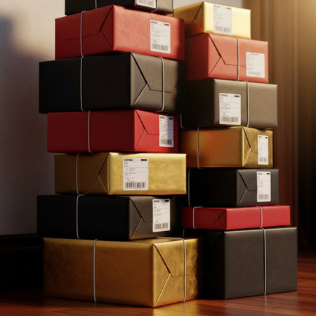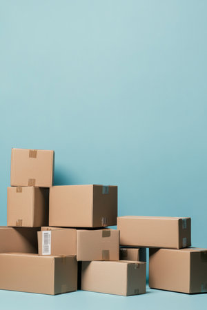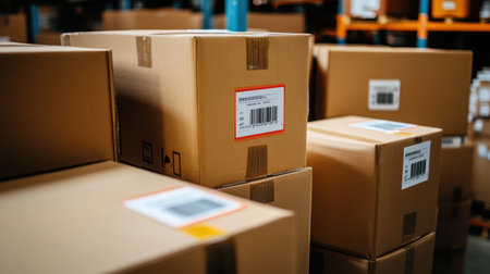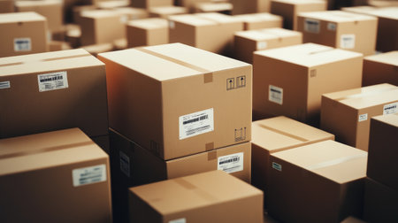 Neatly stacked cardboard boxes with barcodes and fragile labels showcase organized logistics and efficient packaging.