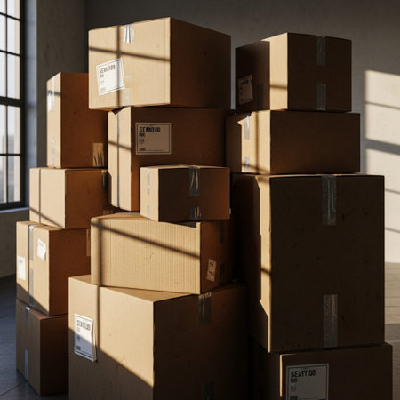 Stack of cardboard boxes with shipping labels and fragile stickers in a warehouse setting, ready for delivery