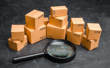 Cardboard boxes pile. Production goods and products, distribution and trade exchange goods, retail sales. Global business, import, export. Freight transportation. Logistics and warehousing. Shipment