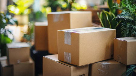 Close-up of stacked cardboard boxes with packing tape in an indoor setting surrounded by green plants, ideal for shipping and business themes.
