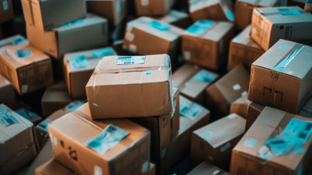 A large collection of cardboard boxes piled up in a warehouse setting. This image conveys the concept of shipping, logistics, and e-commerce, with boxes ready for delivery.
