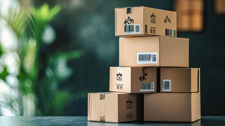 A balanced stack of cardboard boxes on a plain surface, with barcodes and shipping symbols visible, highlighting logistics, packaging, and transportation industries