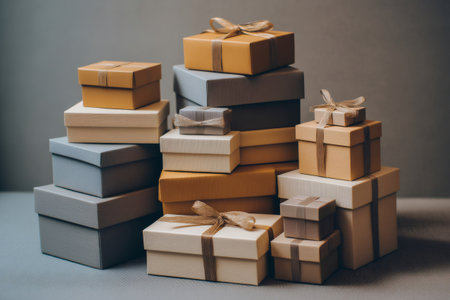 A collection of empty cardboard gift boxes in varying sizes stacked and arranged on a plain beige background The boxes feature neutral tones of beige and gray with smooth matte surfaces creating...