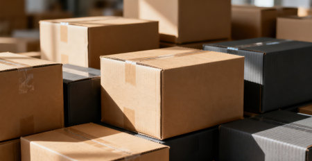 A captivating close-up of stacked brown shipping boxes, elegantly arranged with warm lighting. Perfect for visualizing e-commerce logistics and packaging concepts.