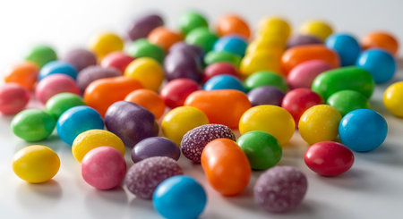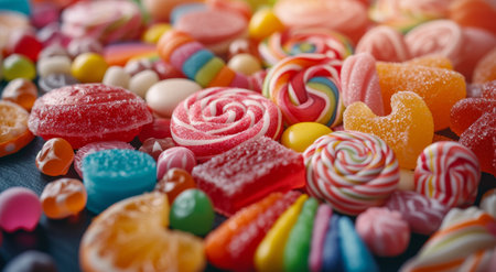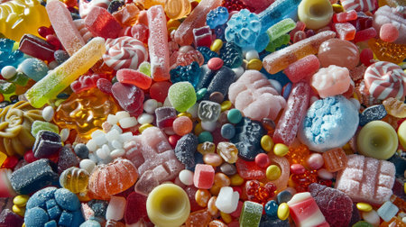 Wide variety of colorful candies are laying on a surface, creating a vibrant and festive sugary background