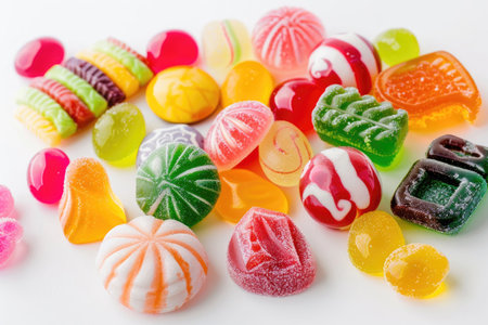 Assorted colorful candies on a white background.