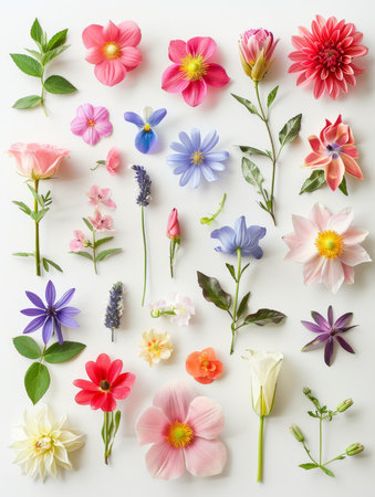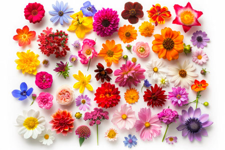 A mesmerizing set of diverse and vibrant flowers, each delicately isolated on a pure white background, radiating natural beauty and floral elegance. Perfect for botanical enthusiasts and floral design.
