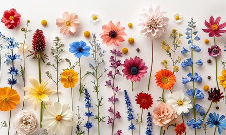 A vibrant array of colorful wildflowers arranged beautifully on a bright white surface for all to admire