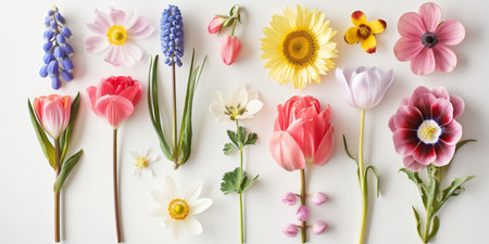 Various vibrant flowers including daisies, gerbera, and peonies are arranged in a line against a clean white background, showing their bright colors and unique shapes.