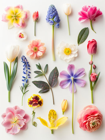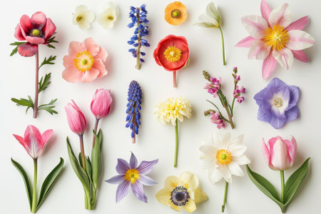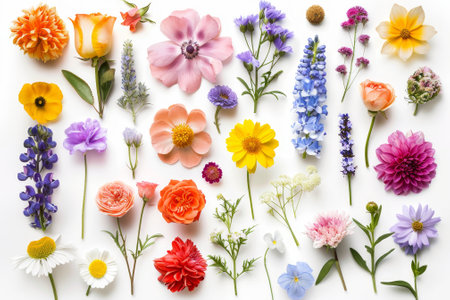 A vibrant collection of fresh flowers arranged artfully on a white background, showcasing a variety of colors and types. Perfect for design projects.