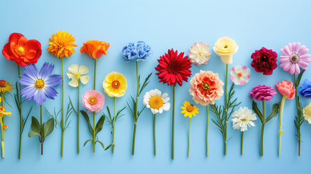 Vibrant Collection of Various Blooming Flowers Lined Up on a Serene Blue Background