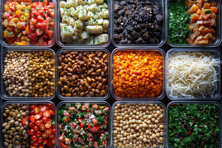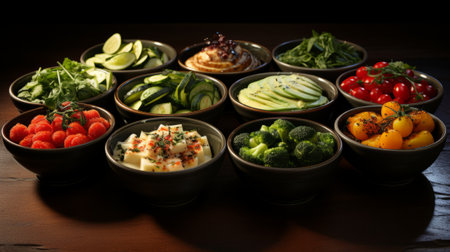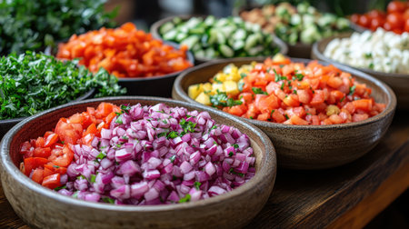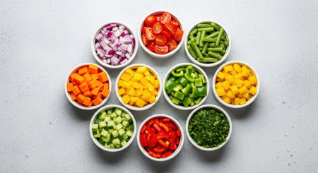 A stunning display of fresh ingredients in bowls, showcasing vibrant colors and textures. Perfect for culinary creations, meal prep, and gourmet recipes.