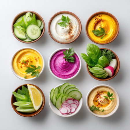 A vibrant array of colorful dips and fresh vegetables arranged in bowls on a clean white surface, perfect for appetizers or healthy snacks.