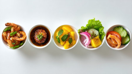 This captivating image showcases five small bowls filled with a variety of healthy foods including shrimp, mango, salad, and vegetables, perfect for nutritious meals.