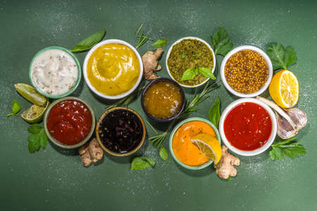 Assortment of different classic sauces and dips in sauceboats. Mayonnaise, ketchup, tartare, mustard, pesto, sour cream, barbecue sauces with spices, herbs, lemon