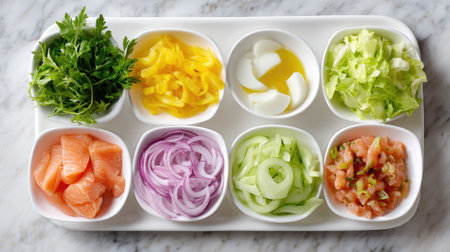 This captivating image features a meticulous arrangement of fresh ingredients in individual white bowls, showcasing the beauty of culinary creativity.