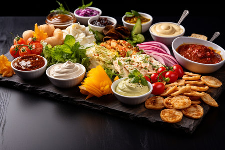 Top view of tasty chips with different sauces in black, generative AI