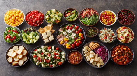 A vibrant assortment of various dishes displayed on a wooden platter, showcasing a mix of colors, textures, and flavors perfect for sharing.