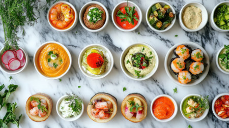 A vibrant array of cicchetti elegantly arranged on a marble table, showcasing various appetizers, dips, and toppings for a delightful dining experience.