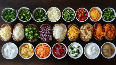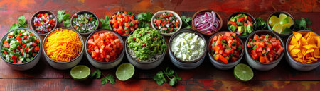 A vibrant array of fresh ingredients arranged in bowls for a taco bar setup. Includes vegetables, cheese, and toppings for a festive meal experience.