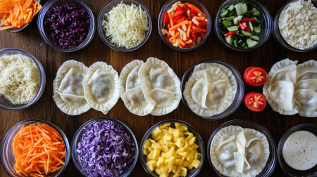 This image showcases a vibrant selection of fresh ingredients for making dumplings, featuring colorful vegetables, cheeses, and meats on a rustic wooden surface.