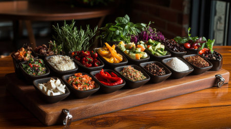 Experience an artistic display of gourmet dishes showcasing fresh ingredients and vibrant colors. Perfect for fine dining themes and culinary art.