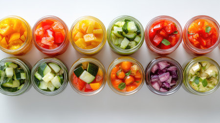 A vibrant collection of fresh fruits and vegetables neatly arranged in jars, showcasing healthy ingredients ideal for meal preparations and colorful displays.