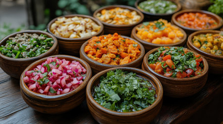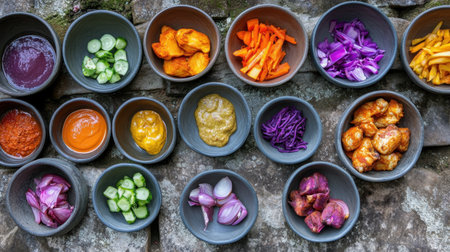 A vibrant arrangement of fresh vegetables and sauces in bowls showcases colorful ingredients that highlight healthy eating and culinary creativity, ideal for food enthusiasts.