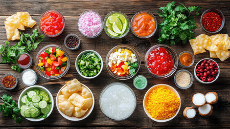 A vibrant and colorful assortment of fresh ingredients and condiments arranged neatly in bowls on a rustic wooden table, perfect for taco preparation and culinary creativity.