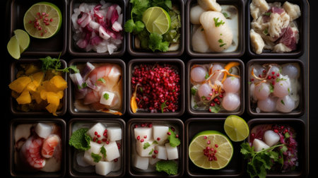 deconstructed fruit salad with ingredients in rows, created with generative ai