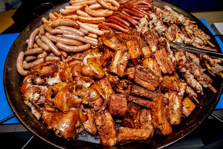 Assorted meat. Grilled sausages, ribs, shank in a large skillet.