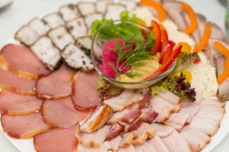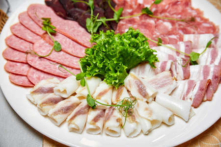 Set of lard, ham, brisket, sausage and jamon on a white plate. Close-up, selective focus