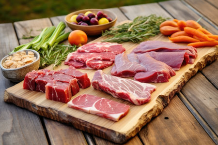 raw meat diet for dogs arranged on a wooden board, created with generative ai